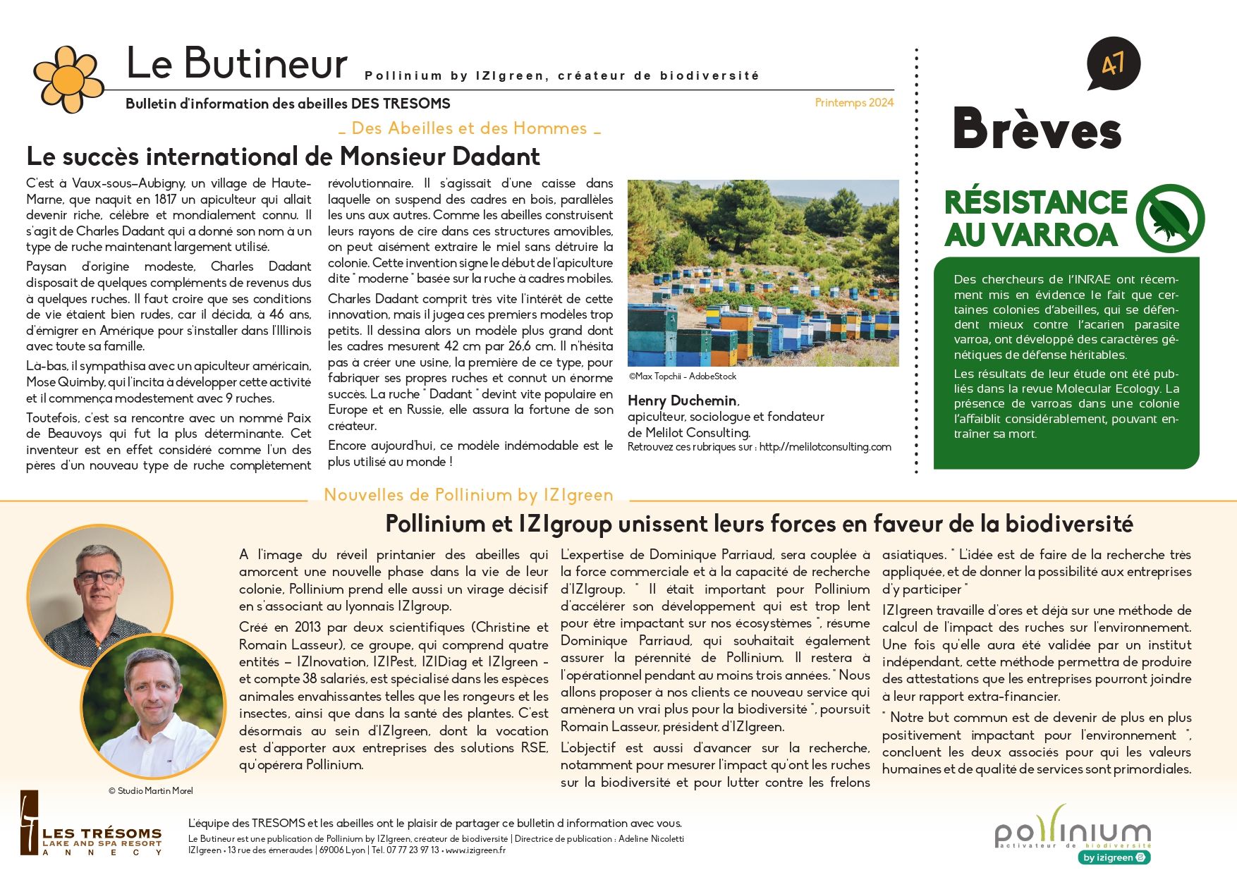 Dans ce numéro, explorez le réveil de la ruche après l’hiver. Apprenez-en plus sur la reine qui reprend sa ponte, l’histoire de la célèbre ruche Dadant et les recherches menées sur l’impact des ruches sur la biodiversité. Découvrez aussi les nouvelles ambitions de Pollinium by IZIgreen pour préserver notre écosystème.